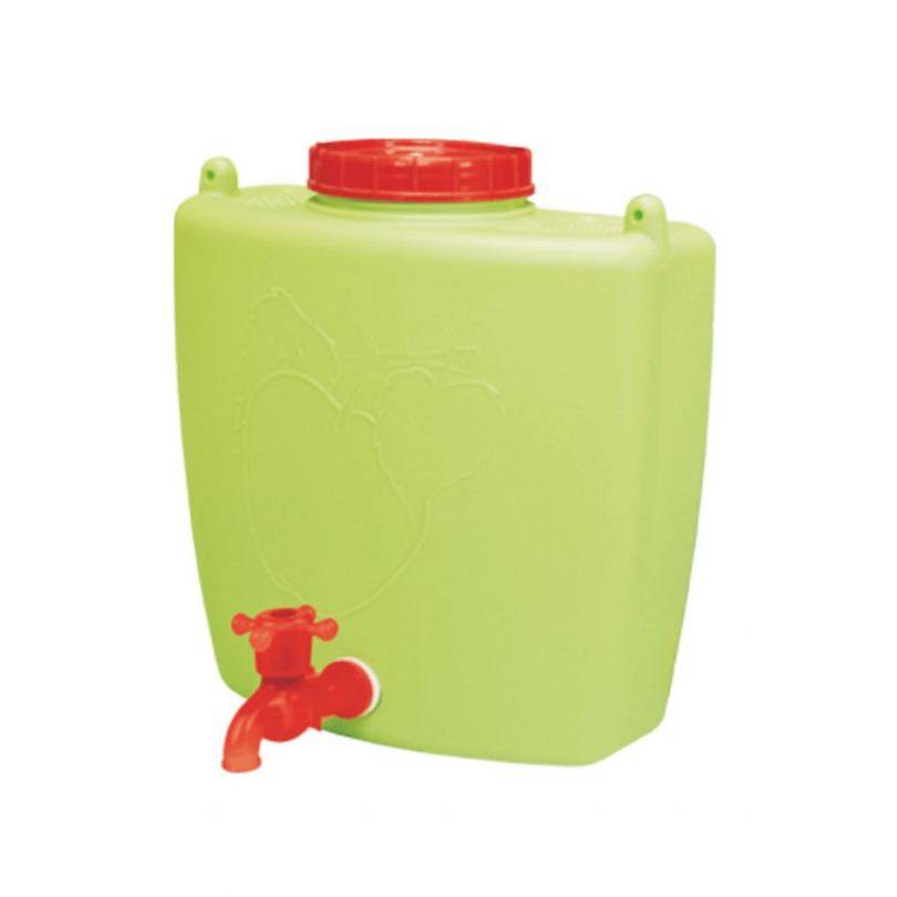 - Такой же краник (или покупной, из хозяйственного магазина) можно приделать к пластиковому контейнеру объёмом от 5 литров. Для этого достаточно просверлить отверстие нужного диаметра и зафиксировать в нём краник. Жестяное или эмалированное ведро в качестве ёмкости тоже отлично подойдёт.