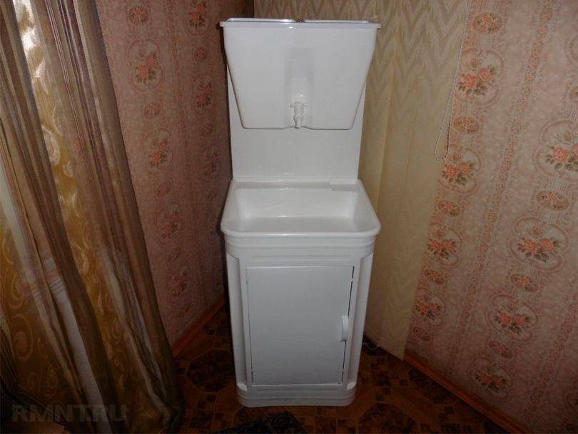 Ведро для слива спрятано под раковиной в тумбе. Раковина, так же, как и бачок для воды, может быть выполнена из пластика или нержавеющей стали.