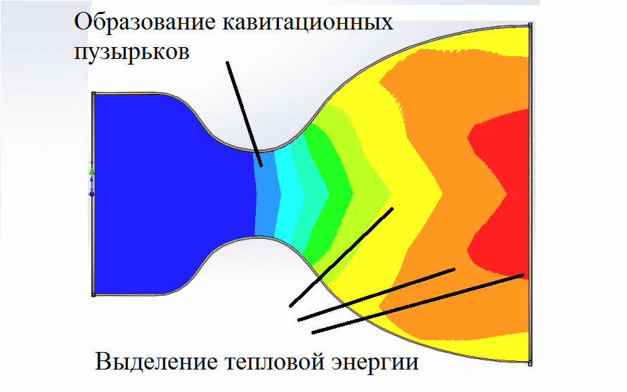 - Преобразование механической энергии в тепловую. Выходя из активатора, жидкая среда теряет ускорение и, в результате резкого торможения, возникает эффект кавитации. В результате, кинетическая энергия нагревает жидкую среду до + 95 °С, и механическая энергия становится тепловой.