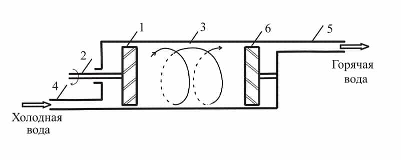 Идеальным вариантом установки считается теплогенератор Потапова, который имеет вращающийся диск (1) установленный напротив стационарного (6). Подача холодной воды осуществляется с трубы расположенной внизу (4) кавитационной камеры (3), а отвод уже нагретой с верхней точки (5) той же камеры. Пример такого устройства приведен на рисунке 2 ниже: