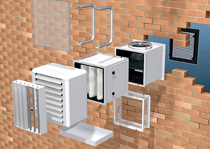- Очищенные и подогретые массы при помощи вентилятора поступают в помещение. Благодаря установленному диффузору они равномерно распределяются по всей площади.