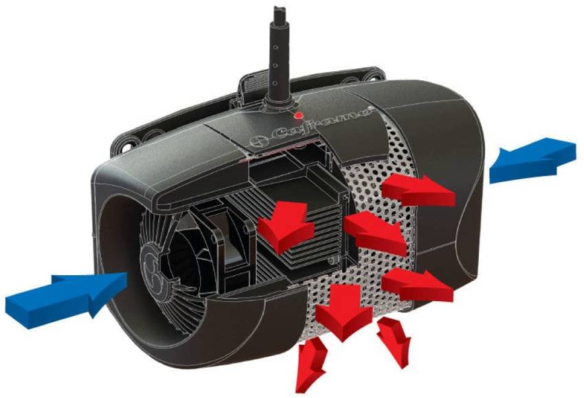 - встроенный вентилятор направляет подогретые воздушные массы в помещение;
