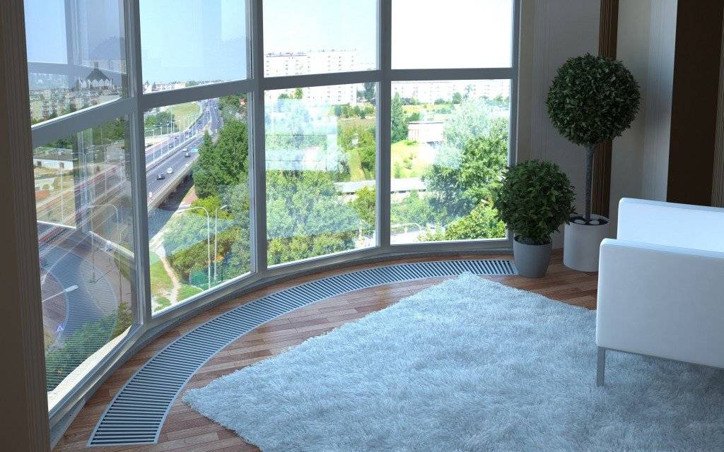 Современные здания имеют разнообразные архитектурные формы, в которые не вписываются стандартные радиаторы. Проблема решается с помощью угловых и радиусных внутрипольных конвекторов. Такие устройства необходимо заказывать, то есть, выезжать на объект и производить замеры.