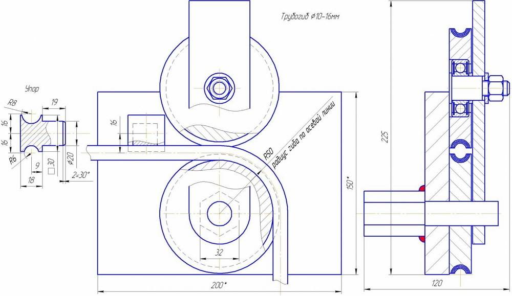 Все детали, за исключением вальцов, можно найти в своих запасниках. Чертеж ручного трубогиба наглядно демонстрирует простоту конструкции.