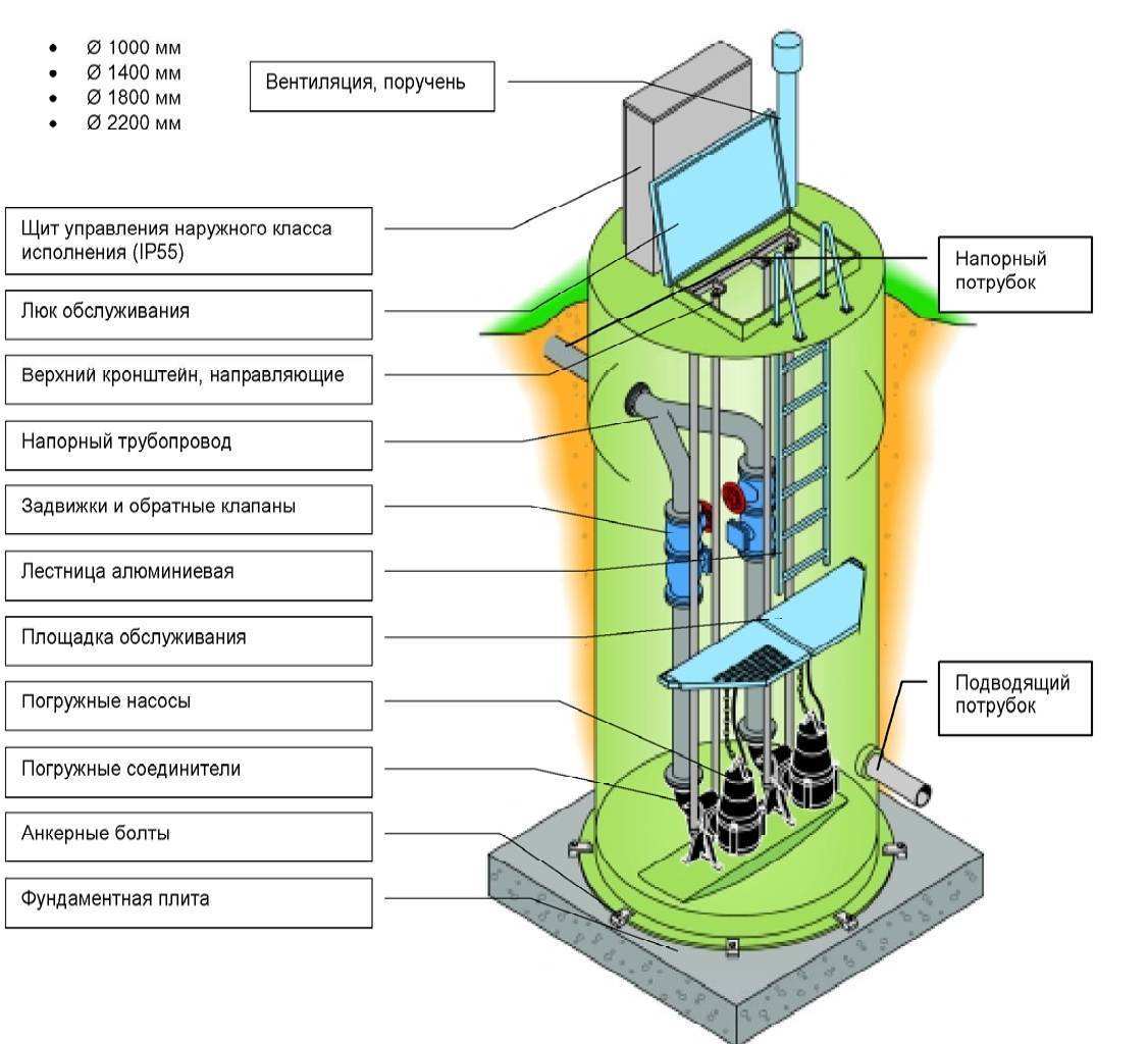 Станция по своей сути — герметичная сливная яма, которая оборудована одним или несколькими насосами. С их помощью и происходит транспортирование сточных вод в нужное направление. Давайте выделим основные элементы оборудования: