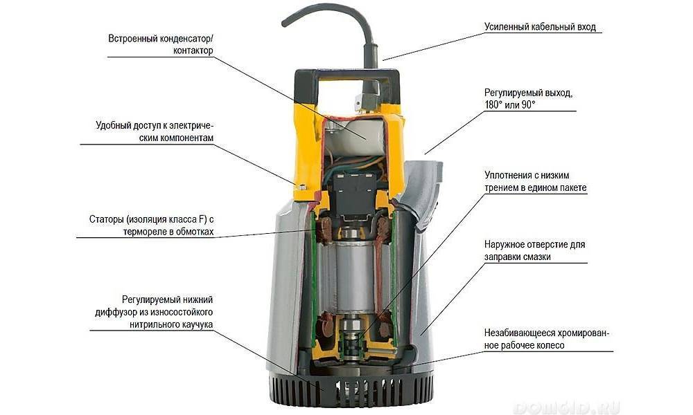 - погружные — используются для откачки воды из выгребных ям, колодцев и подвальных помещений;