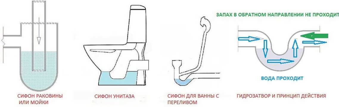 К стояку подводятся разные трубы (вентиляционные и канализационные), а сантехника соединяется с трубами сифонами. Загляните под раковину, ванну, за унитаз. Видите там изогнутую гофрированную трубу? Это и есть сифон. Если у вас старая сантехника советских времен, то это будет стальная труба с коленом. Какой бы ни был сифон, он служит для образования гидрозатвора. Его главная задача – не дать запаху проникнуть в помещение. В колене образуется гидрозатвор – пробка, «заглушка» из воды.