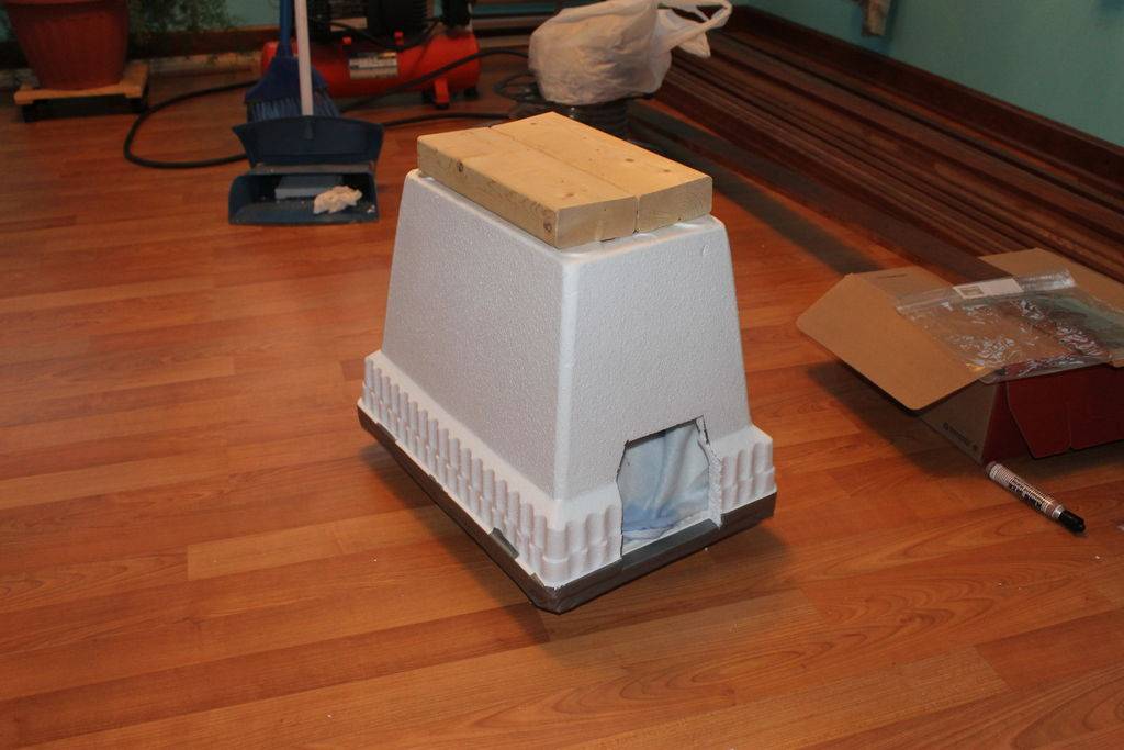 - При наличии под рукой поддона, брусьев из дерева или других аналогичных элементов вы можете сделать из них своеобразные салазки или помост, поскольку теплая будка для кошки должны находиться на некотором расстоянии от земли или тротуара.