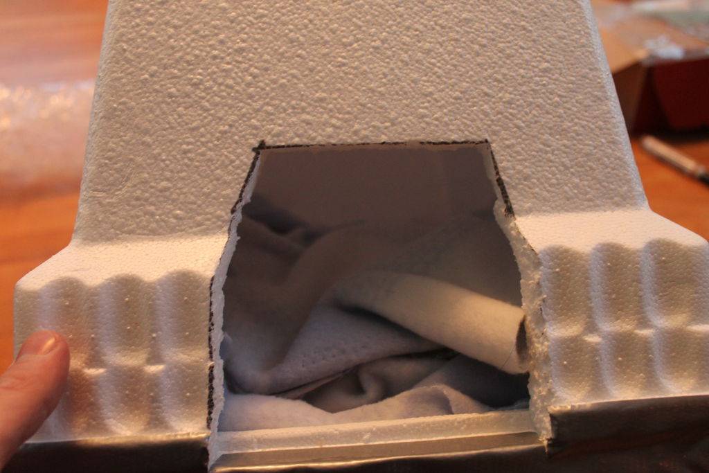 - Заполните его внутри утеплителем, например, плитами пенопласта, которые предварительно надо будет вырезать по размеру.