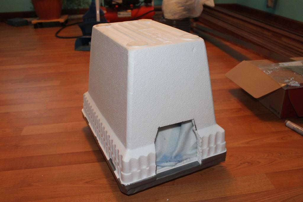 Домик для уличной кошки изготавливают из самых простых материалов, которые подойдут для зимовки. Возьмем, к примеру, будку из термобокса. Все что требуется – приобрести термобокс подходящих размеров, вырезать отверстие и немного утеплить помещение для зимы.