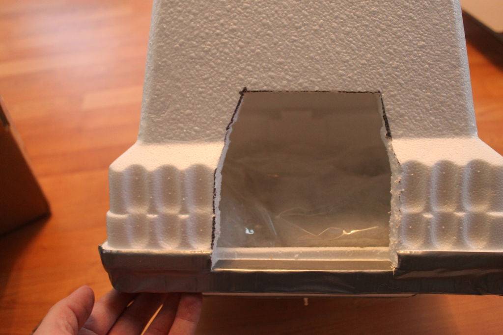 Если кот может просунуть свою морду, значит сможет просунуть и остальное тело (если он конечно не толстяк), поэтому я решил не делать вход слишком большим, кроме того это поможет избежать лишней потери тепла.