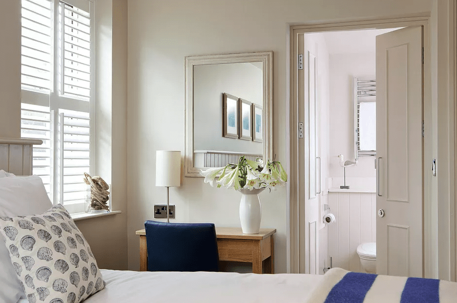 Такая атмосфера освежит юго-западные комнаты. Подход к оформлению помогает зрительно расширять пространство. Популярно выполнение отделки стены с изголовьем кровати деревянными панелями. Такой ход удачен для узкой комнаты.