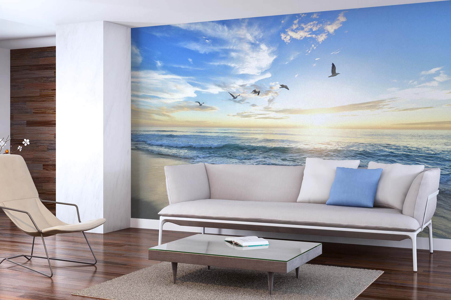 В зале и гостиной цвета могут быть смелее, а изображения объемнее. Расширяющими обоями с фотопечатью можно выделить зону отдыха, оформив стену за диваном, отделать акцентную стену за телевизором или выбрать произвольную область, на которую будет падать взгляд.
